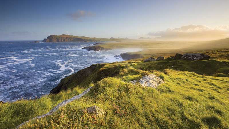 Idag väntar färd genom väldigt skiftande natur trots att vi inte färdas någon längre sträcka. Vi lämnar Galway på morgonen och tar oss ut på en vid kalkstens platå vid namn the Burren. Härifrån fortsätter vi till de mäktiga klipporna Cliffs of Moher som stupar 200 meter rakt ner i Atlanten. Vi gör en promenad för att känna vinden och försöka fästa denna fantastiska utsikt på ett foto. Färden fortsätter sedan på smala vackra vägar ner till Irlands längsta flod, Shannon. Här återfinner Irlands bäst bevarade slott Bunratty. Detta var en viktig handelsplats för vikingarna och vi känner historiens vingslag under en rundtur där vi får se och höra om slag och vardag för slottsherrarna på den här tiden. Vi korsar sedan floden och kommer till den idylliska byn Adere på vår väg till Kerry där middag och övernattning i två nätter väntar. Cirka 25 mil.