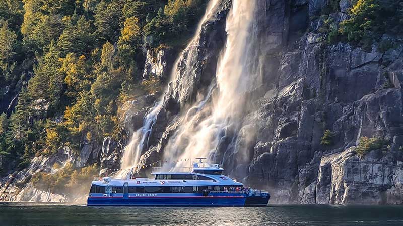 Innan vi lämnar kusten gör vi en vacker båtfärd genom den 42 km långa Lysefjorden till Lysebotn där de höga bergen som på vissa ställen går upp mot 1000 meters höjd kantar vår väg nästan lodrät. Vi seglar bland annat under den mäktiga Predikstolen som går ut i en smalplatå 600 meter över vattenytan och som är en av de mest fotograferade platserna i landet. Vi ser även Kjerag som är en stor sten som är fastklämd mellan de höga bergen. Vi fortsätter efter denna avkopplande båttur med bussen och åker om vädret tillåter upp till örnnästet för ett fotostopp. Vi återvänder sedan till Stavanger där eftermiddagen är fri. På kvällen går vi ombord på Fjord Lines fartyg för färd mot Danmark. Ombord väntar middag och underhållning samt övernattning. Cirka 35 mil.